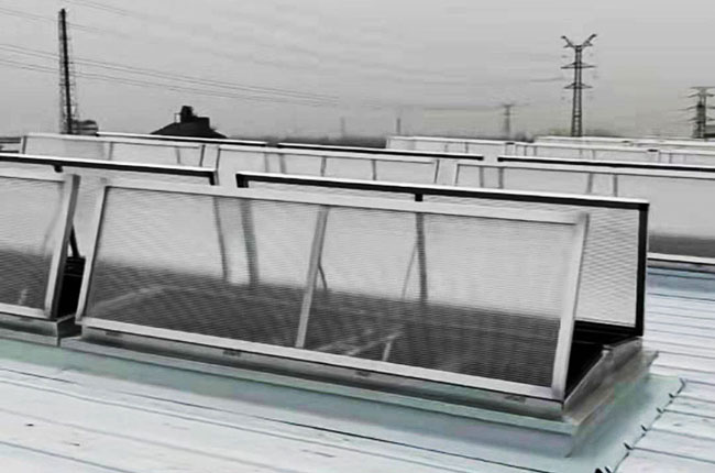 適用于以采光為主、通風為輔的建筑。天窗完全開啟時,排煙量***,***開啟角度為60°。窗體上面與安裝面成30°角, 夏季有利于排水,冬季不積雪。